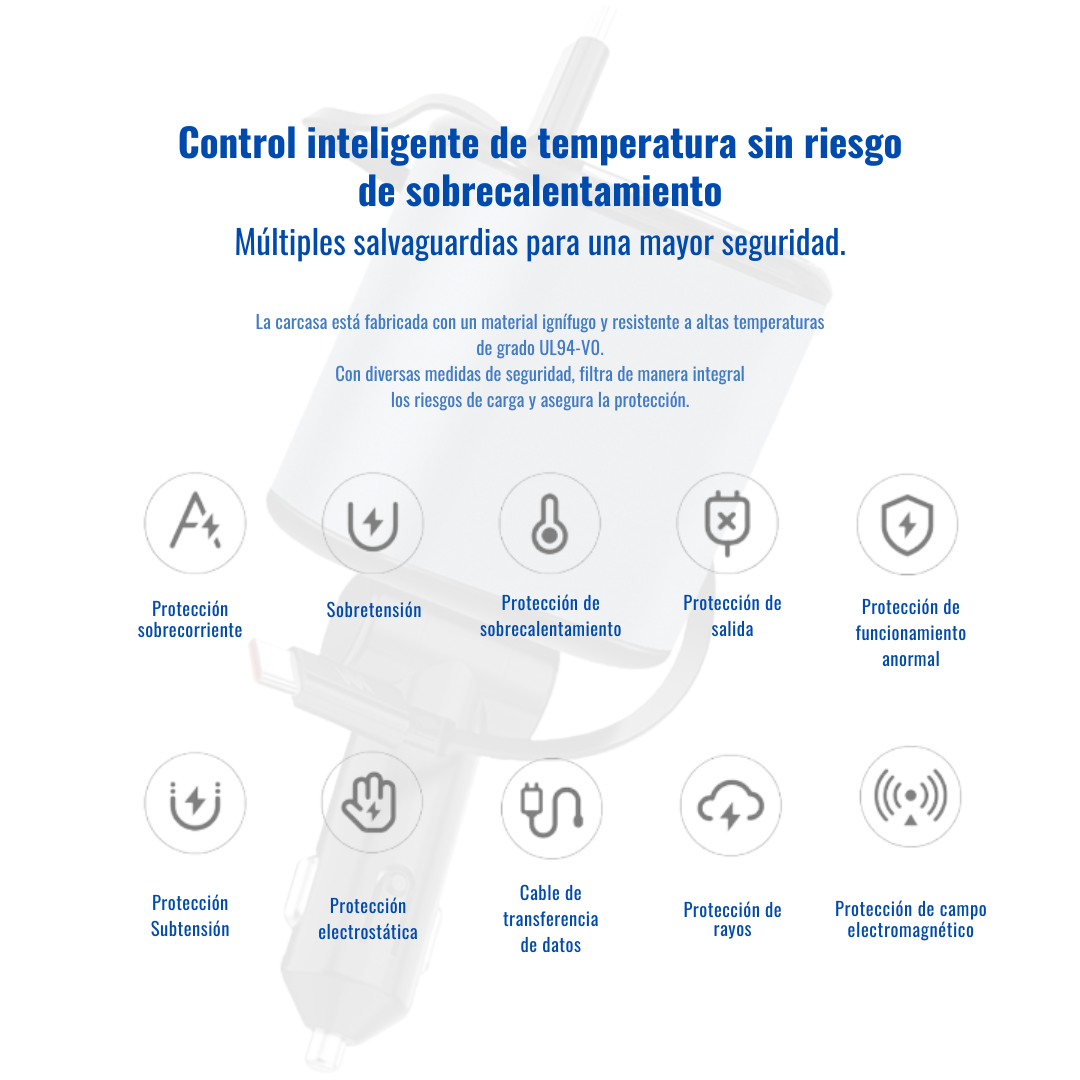 Este potente cargador 4 en 1 es ideal para quienes buscan eficiencia y orden en su vehículo. Cuenta con dos cables integrados retráctiles: uno con conector Lightning para dispositivos Apple y otro con conector Tipo-C para Android u otros dispositivos. Además, incluye dos puertos adicionales: un USB-A de 2.4A y un USB-C de carga rápida de hasta 3A. Con un diseño elegante, compacto y construido con materiales retardantes al fuego, es el aliado perfecto para mantener todos tus dispositivos cargados en carretera.