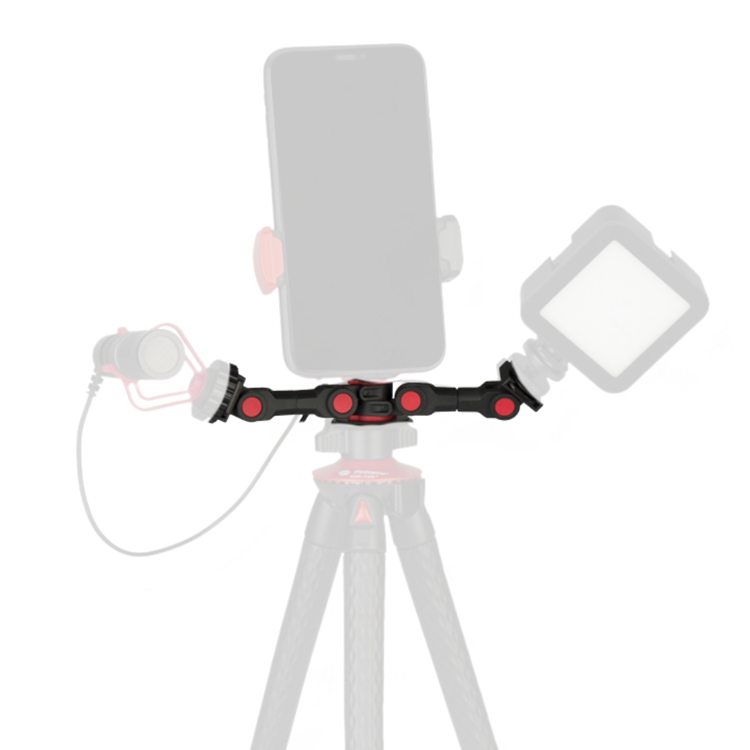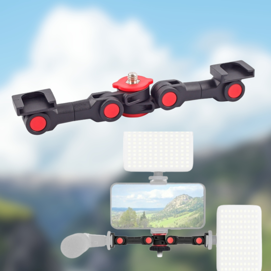 Este versátil adaptador cuenta con rosca universal 1/4 hembra y macho, lo que permite instalarlo fácilmente sobre trípodes, estabilizadores, cámaras DSLR o soportes de mano. Su diseño en doble brazo articulado con múltiples puntos de ajuste ofrece estabilidad y flexibilidad, permitiéndote personalizar la posición de tus accesorios para lograr el mejor ángulo en cada toma.
