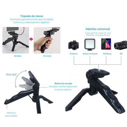 Trípode multifunción que se convierte en grip de mano para grabaciones en movimiento.