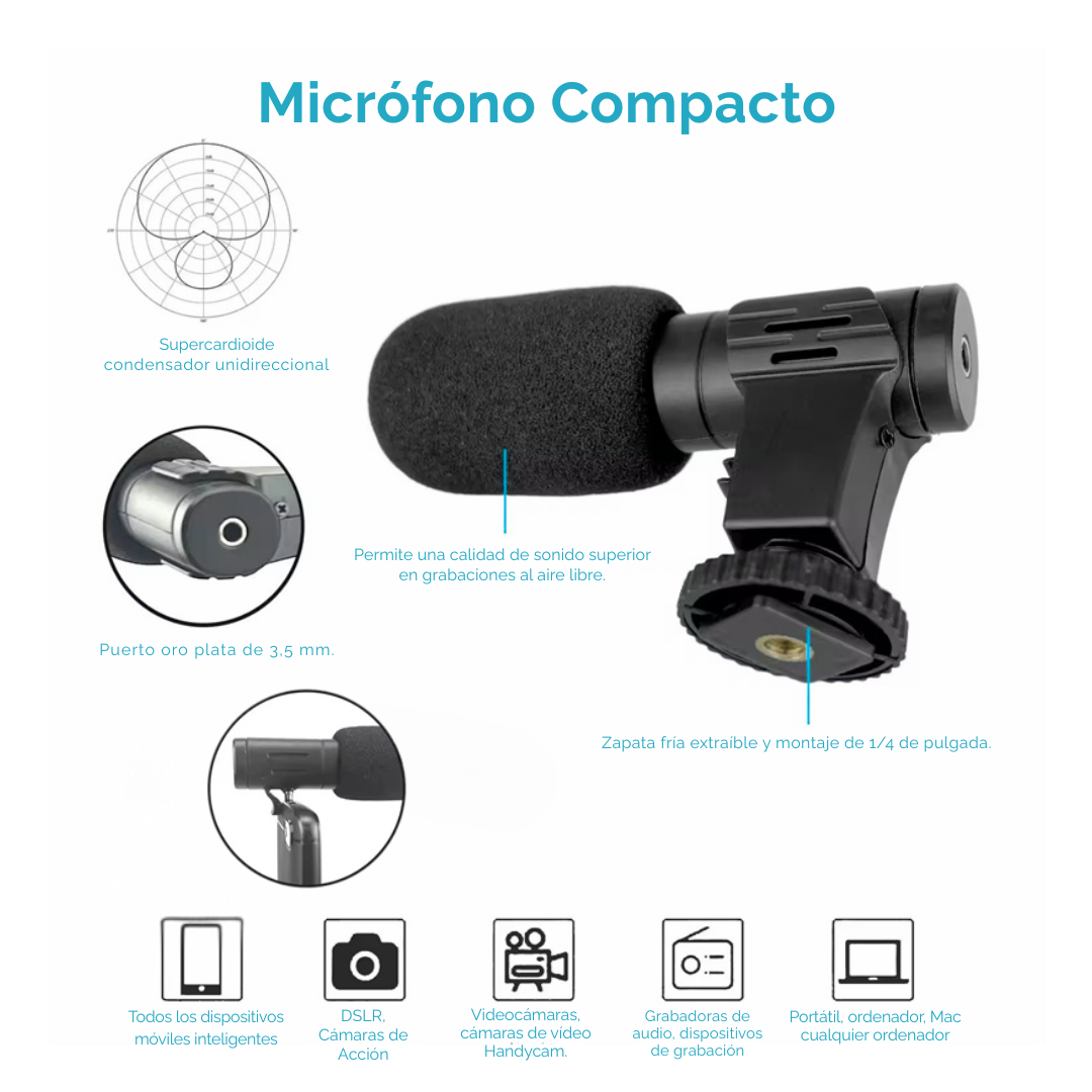 Diseño compacto y portátil, ideal para viajes o grabaciones en exteriores.