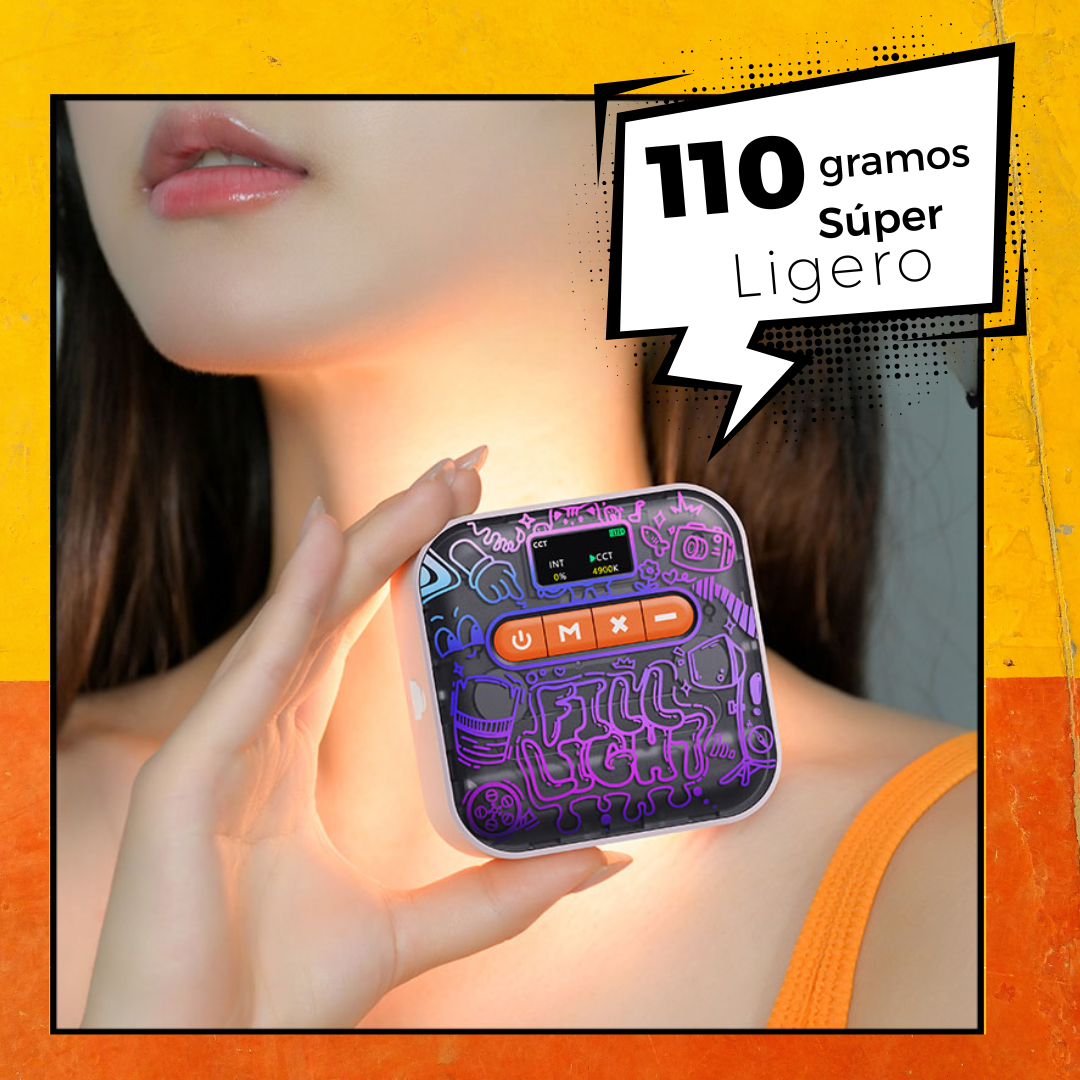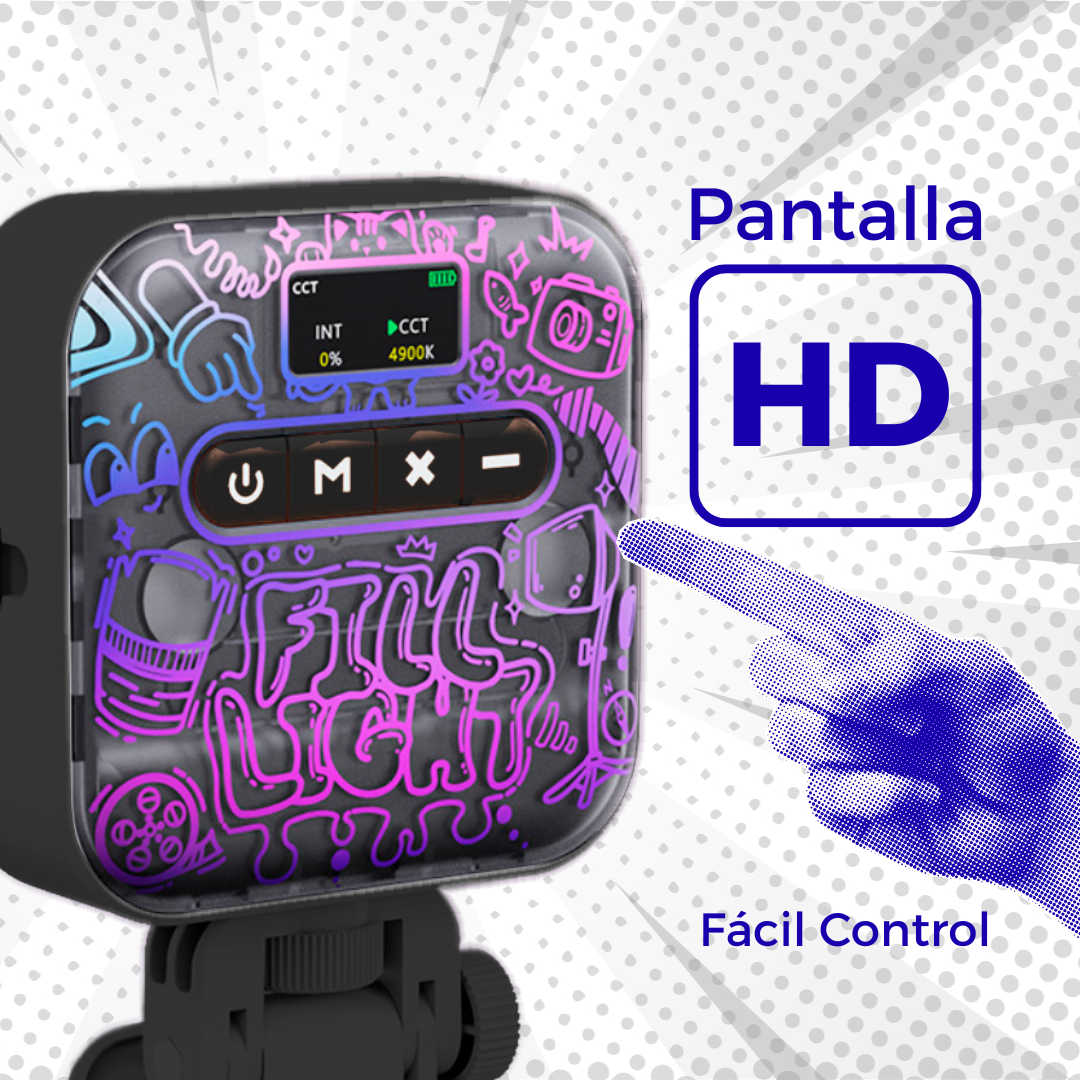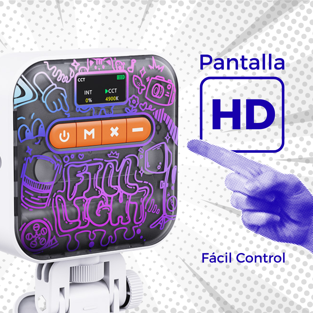 Esta luz cabe fácilmente en el bolsillo, funciona sin cables y es completamente recargable. Su estructura incluye un clip ajustable para sujetarla al celular, laptop, barandas u otras superficies, además de imanes integrados que permiten fijarla en superficies metálicas. Su pantalla HD permite un control visual claro e intuitivo del modo de color, intensidad y temperatura.