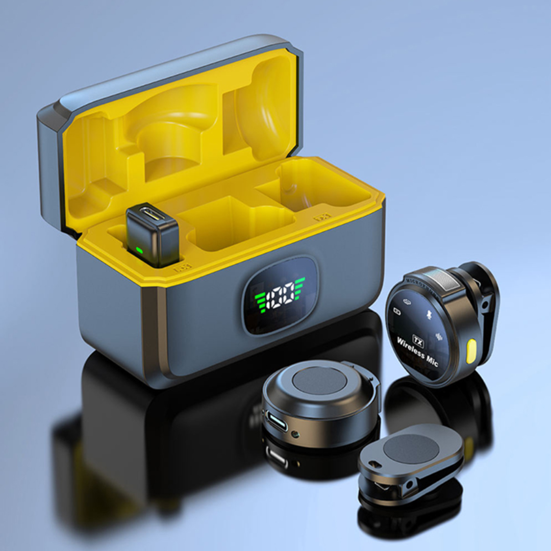 Cada micrófono tiene autonomía suficiente de 6-8 hrs para sesiones largas de grabación, y el estuche portátil permite recargas adicionales.