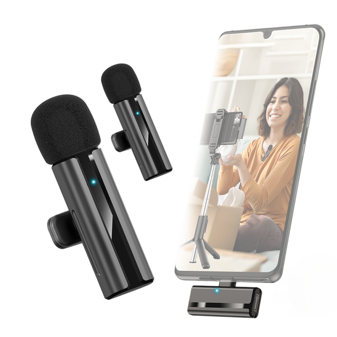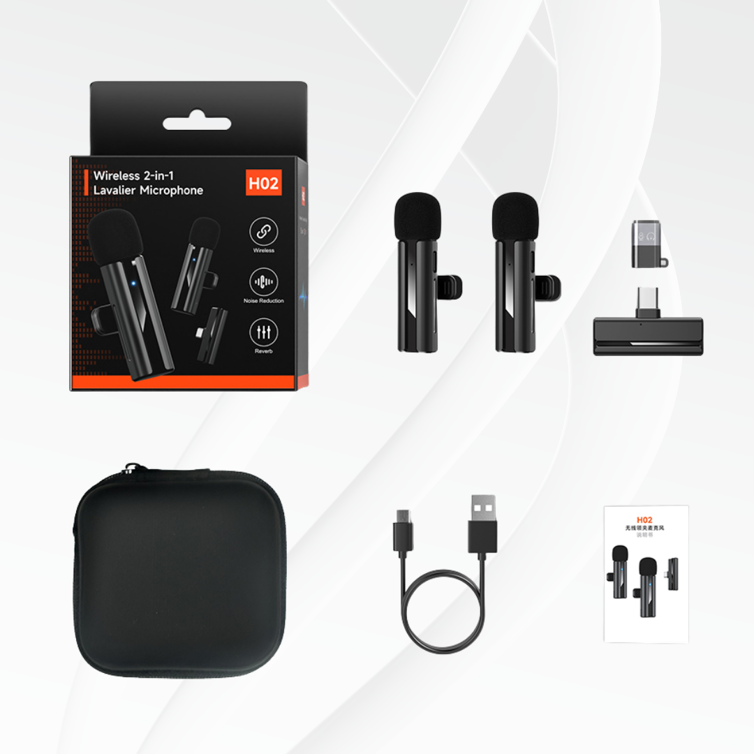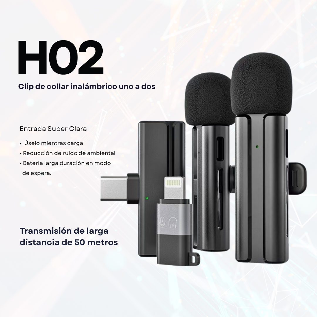 El Micrófono Lavalier Inalámbrico H02 es un sistema profesional de grabación que incluye dos transmisores (TX) y un receptor (RX), ideal para grabaciones en dúo, entrevistas, transmisiones en vivo y creación de contenido desde dispositivos móviles.