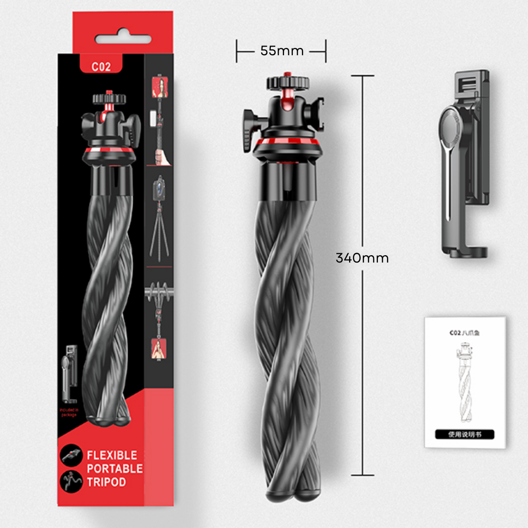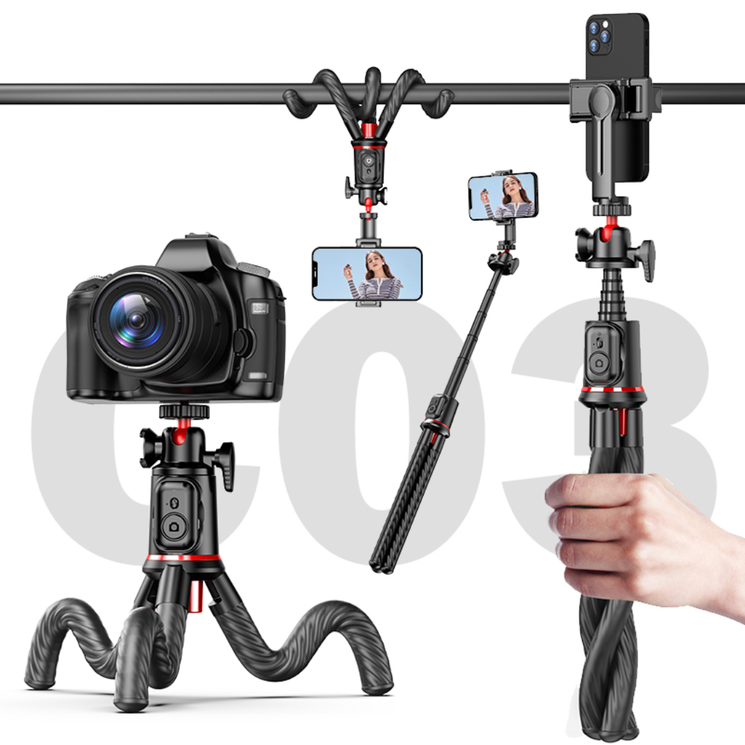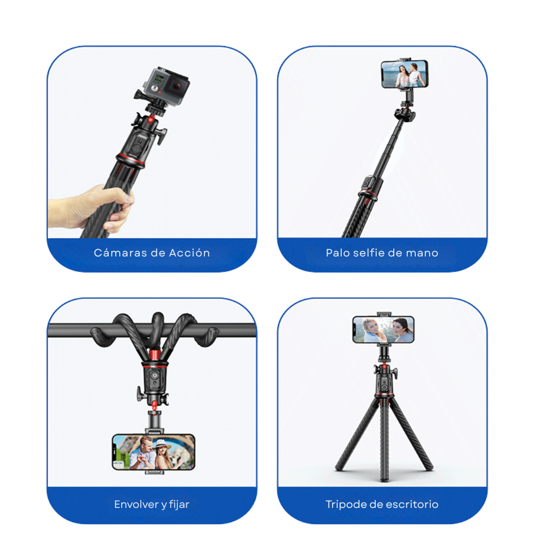 Este trípode, también conocido como “Octopus Tripod”, destaca por su capacidad de adaptarse a superficies irregulares o envolver objetos como ramas, tubos o barandas. Está fabricado con materiales duraderos y ligeros como el ABS y el aluminio, ofreciendo una combinación perfecta entre portabilidad y estabilidad. Su diseño incluye rotación de 360° y plegado compacto, ideal para quienes buscan practicidad sin sacrificar calidad.